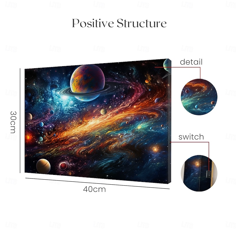 Highlights [Fabric] : Crafted from premium-quality nonwoven canvas material, this universe galaxy LED wall art ensures durability and longevity, while providing a sharp and detailed print. The high-quality material adds a refined and elegant touch to any space, amplifying the vivid colors and cosmic designs. [Design Highlights] : This artwork showcases a mesmerizing 3D printed cosmic scene featuring an array of planets amid a swirling, starry galaxy. The LED lights embedded within the canvas elevate the piece, bringing the vibrant blues, purples, oranges, and yellows to life, making it a captivating focal point in any room. Mounted on a sturdy wooden frame, the art is both up-to-date and durable. [Occasions] : Perfect for adding an element of wonder and intrigue to a living room, bedroom, office space, or any area in need of dynamic and imaginative decor. This wall art is ideal for space enthusiasts and anyone who appreciates a touch of celestial charm in their home decor. [Size Notice] : Available in size 30 x 40 cm (11.8 x 15.7 in), this piece fits well in various spaces, effortlessly enhancing room ambiance with its vibrant display. [Style] : Classic yet imaginative, this wall art blends seamlessly with various decor styles, making it a versatile addition to your home or office.