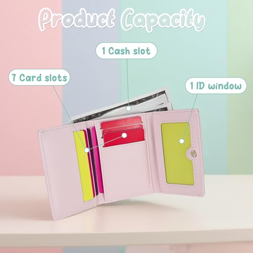 trending ! Cute Wallet for Women, Small Wallet with Cute Cartoon Pattern, Trifold PU Leather Ladies Wallet Slim Card Holder with 7 Slots 1 ID Window 1 Cash Pocket (Pink)