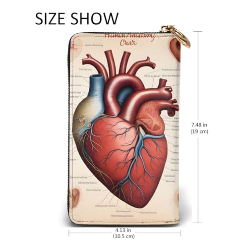 Brand: BROLEOColor: BlackClosure Type: ZipperTheme: heartProduct Dimensions: 7.48D x 4.13W x 0.98HStay organized on-the-go: With 12 credit card slots, 3 full pockets, and various compartments for cash, coins, receipts, and more, the BROLEO Human Anatomy Heart Chart Picture Leather wallet keeps all your essentials in order, making it easy to find what you need quickly and efficiently.Product performance : Large banknote holder with hidden compartment, change compartment, passbook compartment, zipper compartment, ID compartment, card compartment, check compartment, keep your credit cards, cash, coins, receipts, checkbook and mobile phone organized, the zipper design protects your credit cards from being lost and prevents our credit card privacy information leakageStylish and practical: Designed with fashionable girls and women in mind, BROLEO Human Anatomy Heart Chart Picture leather long clutch wallet is both sophisticated and practical, making it a great accessory for any outfit. The soft inner fabric is comfortable and luxurious, adding a touch of sophistication to your everyday look.Durable and environmentally friendly: Made with advanced synthetic leather and quality metal zippers, this wallet is not only durable and waterproof but also environmentally friendly. It is a sustainable choice for those looking to reduce their carbon footprint.The perfect gift for loved ones: Whether you're shopping for your mother, daughter, girlfriend, intimate friends, or teachers, this wallet is a great choice for a thoughtful and practical gift. With its slimfold trifold design and scientific size ratio, it is sure to be a hit with anyone who values both style and functionality in their accessories. Perfect for everyday use. excellent materials and excellent craftsmanship ensure long-lasting durability.