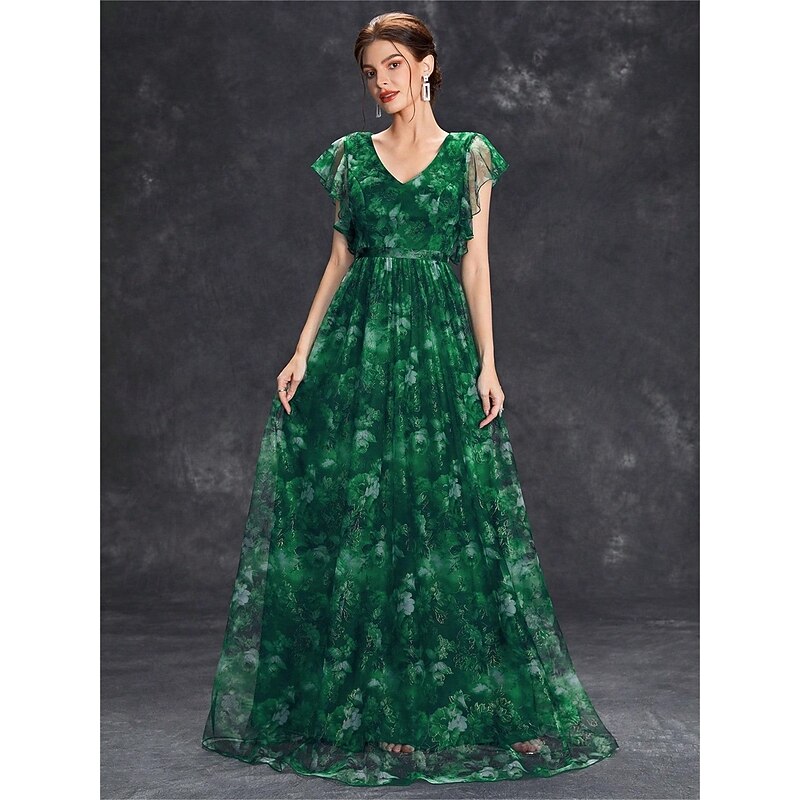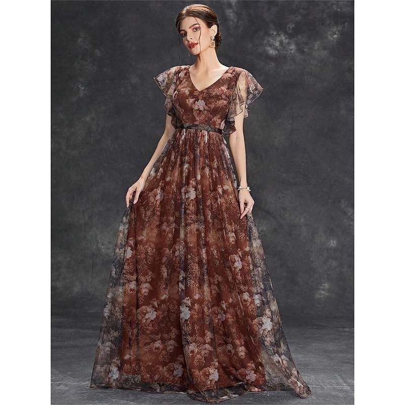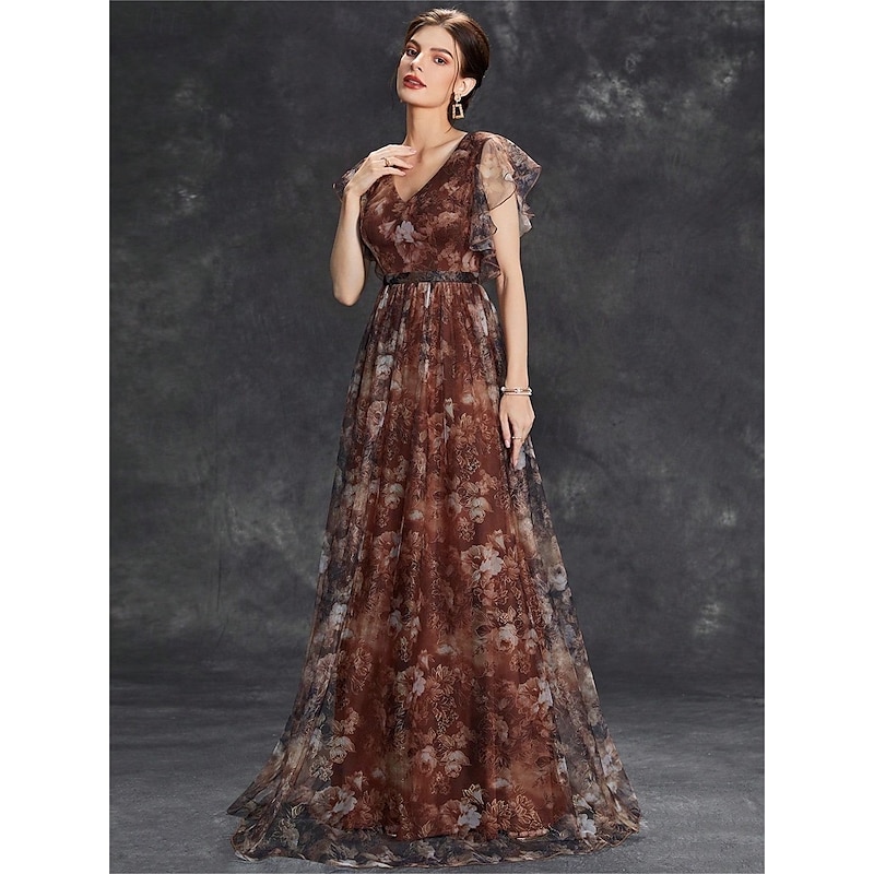 trending ! A-Line Quinceanera Dresses Elegant Dress Formal Wedding Floor Length Sleeveless V Neck Chiffon with Floral Print