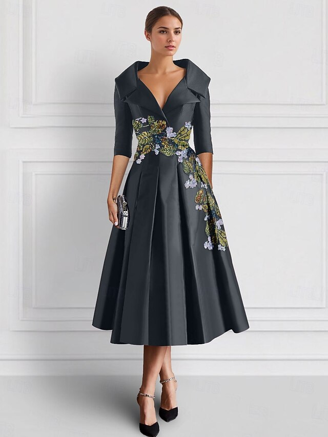 trending ! Embroidered Leaf Floral Lace A-Line Cocktail Formal Wedding Guest Dress Elegant Vintage Shirt Collar Tea Length Satin Half Sleeve
