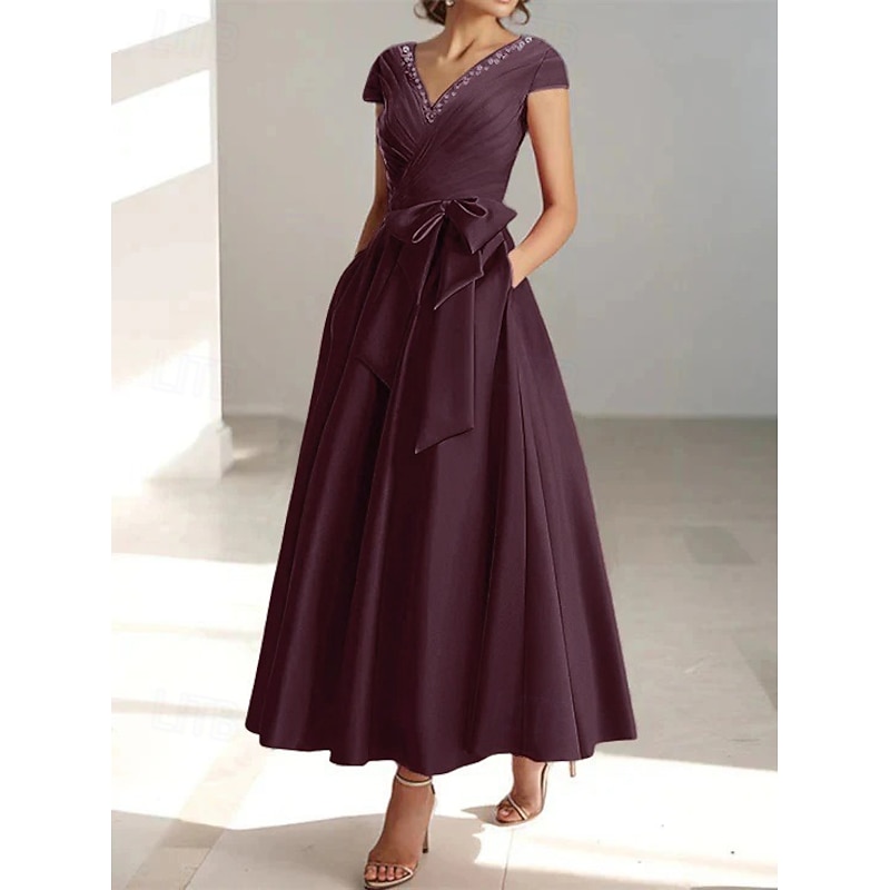 Why Choose A-Line Cocktail Dresses Elegant Formal Wedding Guest Ankle Length Short Sleeve V NeckDress Satin with Bow(s)?