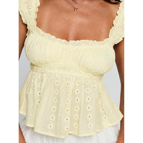 trending ! Women Ruched Babydoll Top Ruffle Sleeveless Square Neck Eyelet Lace Summer Going Out Peplum Top