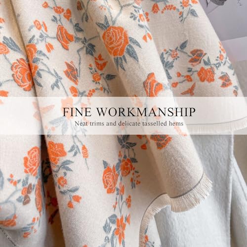 • EXQUISITE DESIGN: The roses that are spread all over bloom joyfully, endowing an esthetical and romantic charm. Brilliant flowers and romantic colors, interpreting the graceful and delicate femininity. Two sides and two colors allow for reversible wear for more versatility. Green, fresh and sweet; Rosy red, comfortable and charming; Orange, energetic and bright. Jacquard weaving accentuate the stereoscopic texture and color layers. Tassels trim the edges, giving it a spontaneous and smart beauty.