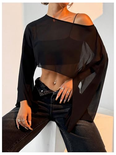 trending ! Women's Y2K Blouse Sheer Flowy Tops Crop Blouses Dressy Poncho Tops Boat Neck Long Sleeve Loose Chiffon Shirts