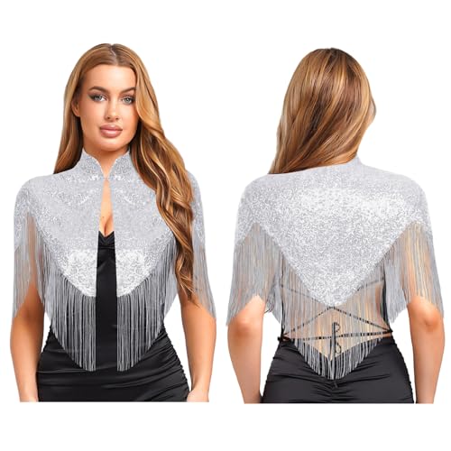 Womens 1920s Sequined Shawl Wraps Sparkly Glitter Fringed Wedding Cape for Evening Party