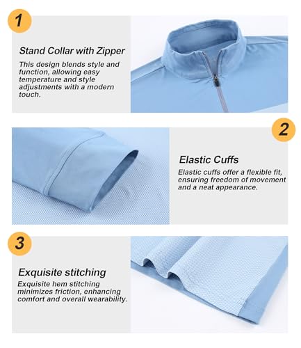 Fabric type: 95% Polyester, 5% SpandexOrigin: ImportedNeck style: Mock NeckSleeve type: Long SleevePremium Fabric Blend: This mens polo shirt, crafted with a premium fabric blend, offers a luxuriously soft touch and exceptional breathability. As one of the top dri fit shirts for men, it keeps you comfortable during everyday wear, making it perfect for active lifestyles and golf shirts for men.sophisticated Wardrobe Essential: This printed polo shirt for men, with a stand collar, elevates your style while adding warmth. Ideal for layering in cooler seasons, it transitions seamlessly from casual to polished occasions, making it a must-have in mens golf polo collections.Thoughtful Design Features: Featuring a quarter-zip design, this zip polo shirt men combines functionality with a relaxed vibe. Elastic cuffs ensure a snug fit, while print and stripe accents add modern flair, making it stylish and practical for both golf polos for men and casual wear.Versatile for Various Activities: Ideal for commuting, gym, golfing, and jogging, this mens golf shirt is versatile. Its wrinkle-resistant fabric and precise stitching suit both casual and active settings, offering comfort and style, making it an excellent choice for mens polo shirts enthusiasts.Easy Care Maintenance: Designed for convenience, this long sleeve polo shirts for men reduces ironing needs. Its wrinkle-resistant properties make maintenance a breeze, allowing you to enjoy more time in comfort and style, making it a thoughtful option for golf gifts for men. Perfect for everyday use. superior materials and excellent craftsmanship ensure long-lasting durability.
