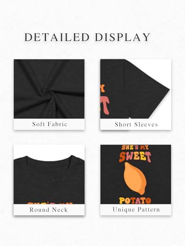 Fabric type: Cotton & PolyesterCare instructions: Machine Wash, Tumble DryOrigin: ImportedClosure type: Pull OnPremium Fabric: Crafted from ultra-soft cotton blend material that provides exceptional breathability and stretch for all-day comfort during festive gatherings while resisting shrinkage and maintaining shape wash after washPlayful Design: Features charming She's My Sweet Potato and I Yam graphics with heart accents creating humorous yet romantic matching sets perfect for couples who love playful styleVersatile Styling: The classic crewneck silhouette and short sleeves make these shirts ideal for Thanksgiving dinners date nights or casual weekend wear with your significant otherThoughtful Gift: An adorable present for anniversaries or Valentine's Day these sweet potato pun shirts come as matching sets to celebrate your love in a fun and rare wayEasy Care: Machine wash cold inside out tumble dry low to maintain vibrant prints avoid bleach to preserve the cute designs long-term and keep them looking new season after season Perfect for everyday use. superior materials and excellent craftsmanship ensure long-lasting durability.