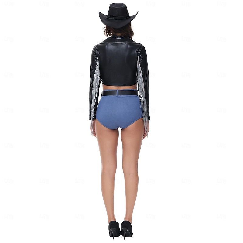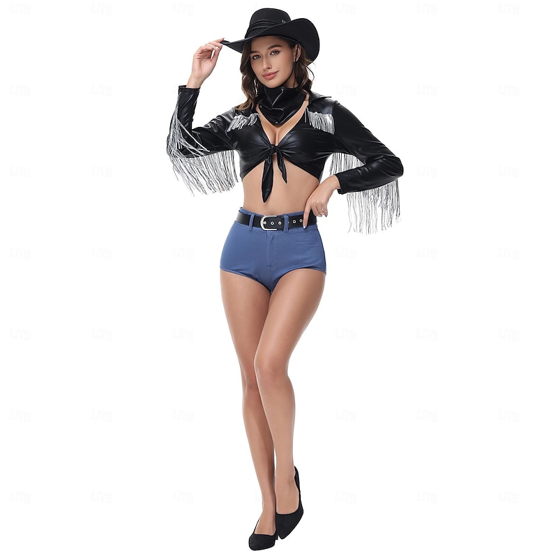Highlights [Fabric and Material] : Crafted from high-quality polyester, this cowgirl carnival costume offers a sleek and shiny appearance that combines comfort with durability. The micro-elastic fabric provides flexibility and ease of movement, ensuring you can enjoy your event without any restrictions. [Design Highlights] : This Western-inspired ensemble features a top made from black faux leather, distinguished by its long sleeves adorned with silver fringe from shoulder to hem for a striking, dynamic look. The front of the top showcases a daring knot tie, exuding confidence and charisma. Paired with the top are high-waisted blue shorts, designed to accentuate your natural curves, complemented by a wide black belt with a silver buckle for a tailored fit. The addition of a retro black wide-brimmed hat completes the outfit, enhancing the Western theme with an iconic finish. [Occasions] : Perfect for masquerade balls, themed parties, or carnival celebrations, this costume brings both style and fun to any fashion-forward event. Whether you're attending a cosplay party or participating in a photoshoot, this ensemble is designed to make you stand out. [Size Range] : Available in sizes M, L, and XL, this costume ensures a great fit across a range of body types, allowing you to choose the size that best suits your measurements. [Garment Care] : The costume is easy to maintain with washable and wet or dry cleaning options, ensuring it stays looking fresh for every occasion. This costume set includes a top, belt, shorts, scarf, and hat to provide a complete look straight out of the box. Perfect for everyday use. excellent materials and excellent craftsmanship ensure long-lasting durability.