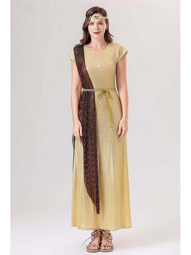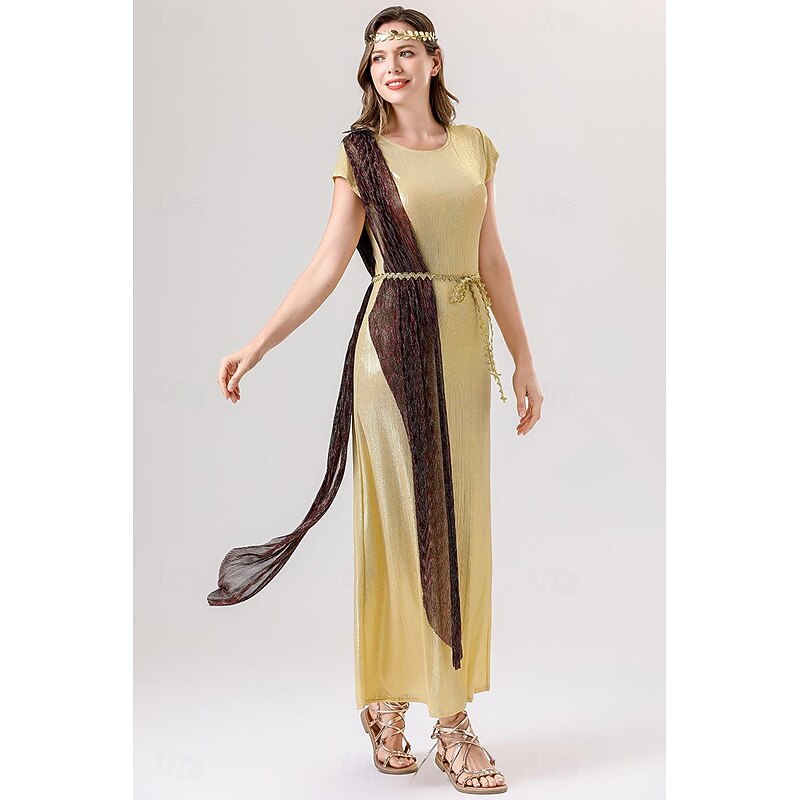Highlights [Fabric] : This Greek Goddess costume is crafted from high-quality polyester, offering a luxurious, smooth texture that catches the light beautifully. The micro-elastic nature of the fabric ensures a comfortable fit, ideal for extended wear during any event. [Silhouette] : The full-length design of the robe creates a flattering silhouette that drapes gracefully along the body. Its flowing lines and elegant cut provide a sophisticated look, perfect for making a statement at any event. [Design Highlights] : The dress features a contrasting sash draped elegantly over one shoulder, adding a touch of regal sophistication. A delicate gold rope belt defines the waist, while the gold laurel headband contributes to its distinctive Grecian-inspired theme. The short cap sleeves and round neckline give the costume a modest yet fashionable touch. [Occasion] : This vintage-inspired cosplay costume is ideal for a variety of events, including carnivals, masquerades, and themed parties. Its one-of-a-kind design and luxurious feel make it a standout choice for making a memorable impression. [Size] : Available in sizes M and XL, this costume caters to a range of body types, ensuring that each wearer can enjoy a comfortable and flattering fit.