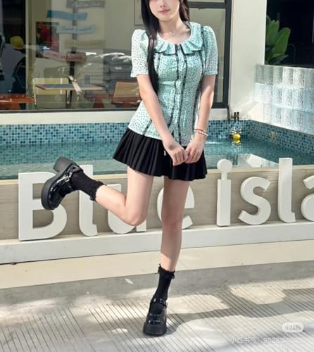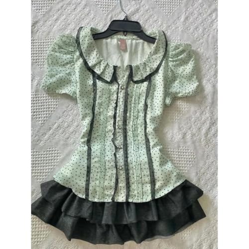 • Product Design: Features a mint green base with black polka dots lace trim ruffle collar pintuck front puff sleeves and a button down closure for a kawaii lolita aesthetic and vintage style