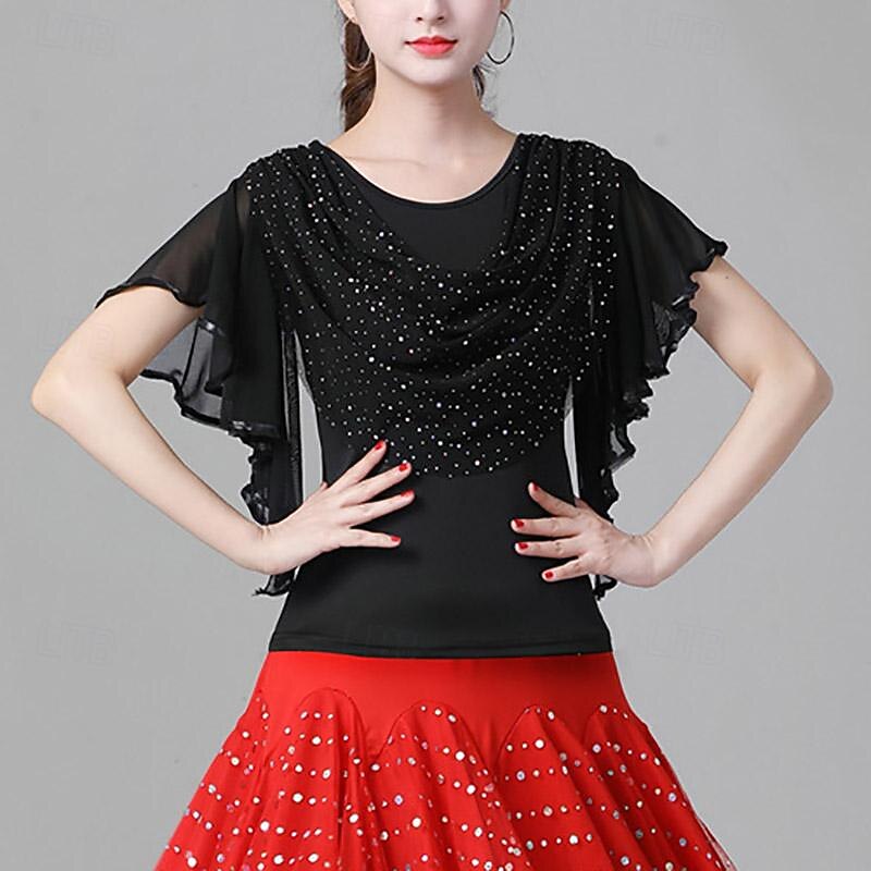 trending ! Latin Dance Ballroom Dance Top Ruffles Pure Color Splicing Women's Performance Training Short Sleeve High Polyester