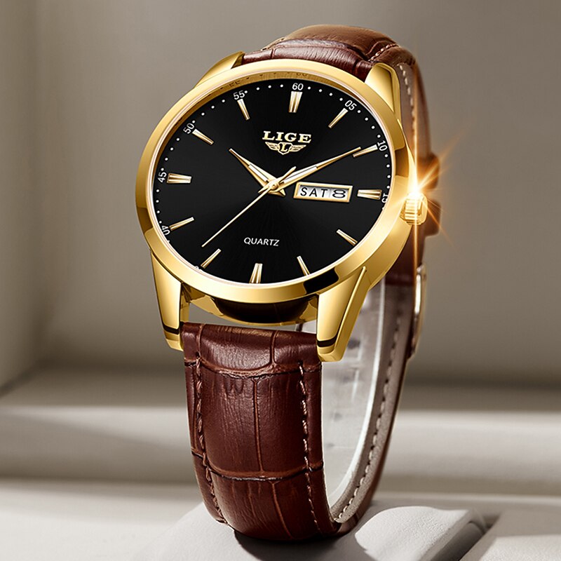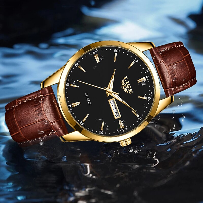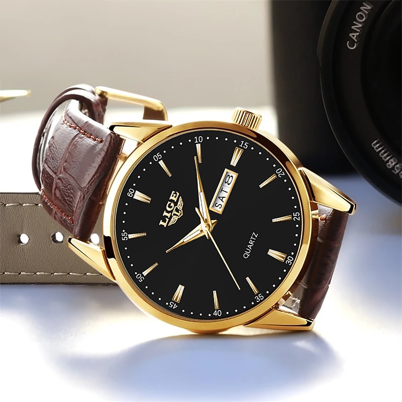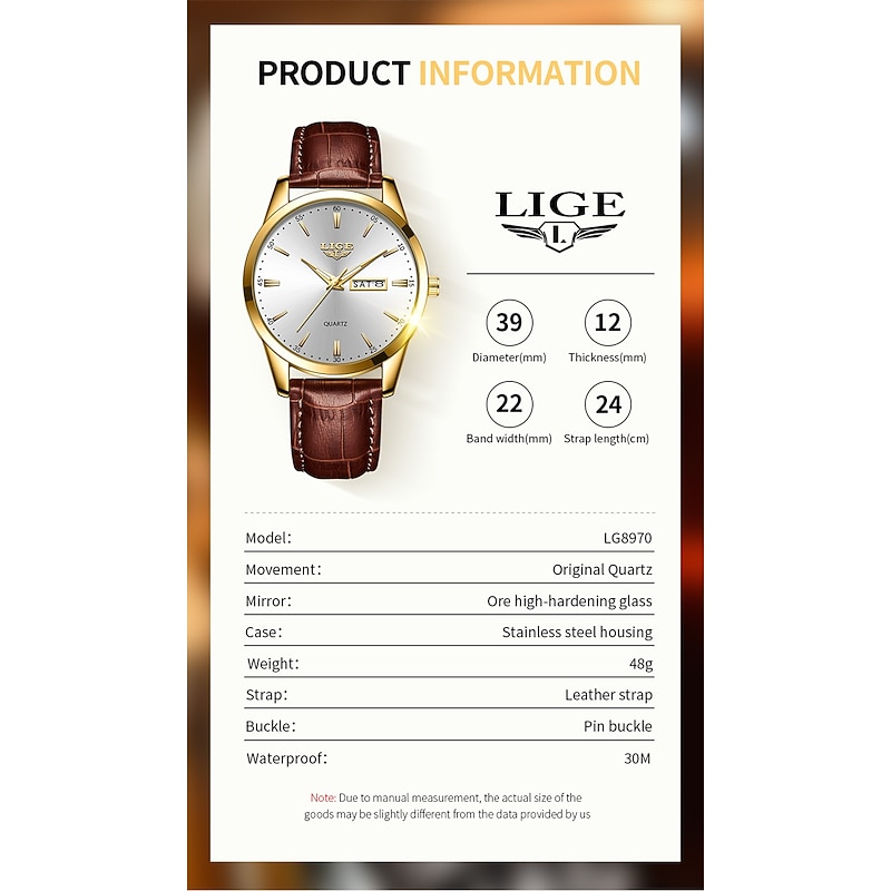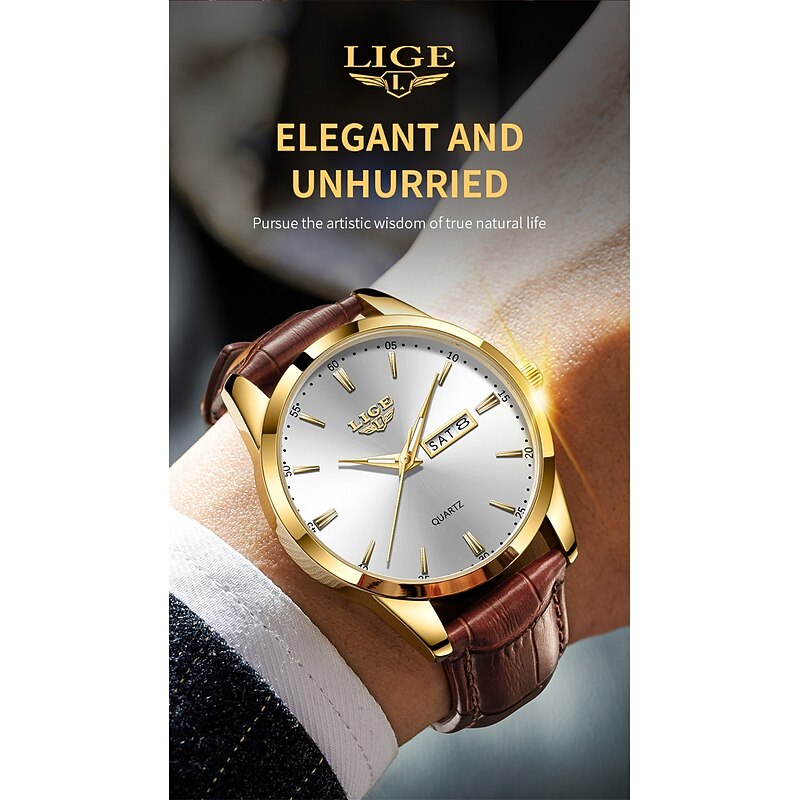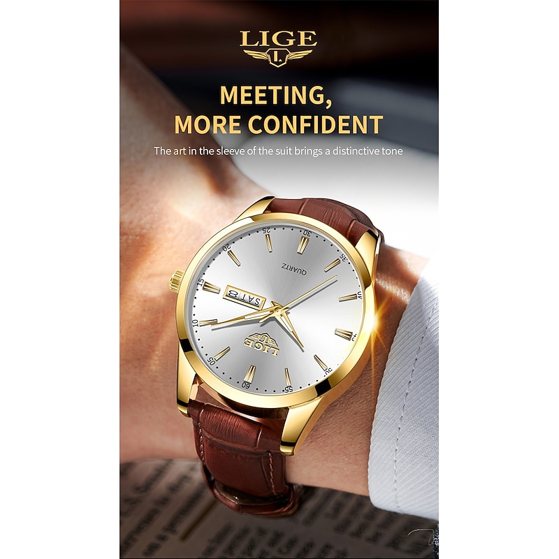 Highlights 1. You can trust in the authenticity of our watches as they are 100% original and genuine. 2. The durable coatings on our eyeglass ensure that our watches will withstand wear and tear. 3. Our watches feature an original quartz movement, providing accuracy and reliability. 4. The leather strap adds a touch of sophistication and comfort to our watches. 5. Our 30M waterproof feature guarantees that our watches can handle splashes and can be worn during light water activities. 6. The addition of a week display and calendar window allows for convenient and practical time management. Additional Selling Points: 1. The watchcase diameter of 3.9cm and thickness of 1.2cm make for a sleek and new-age design. 2. The watch length of 24cm and bracelet width of 2.2cm ensure a comfortable and secure fit for any wrist size. 3. Our watches are lightweight, weighing only 48g, making them easy to wear all day. 4. The package includes one LIGE brand new watch and one box, making it perfect for gifting or personal use. 5. With a two-year warranty, you can trust that our watches are built to last and provide long-lasting satisfaction. Perfect for everyday use. superior materials and excellent craftsmanship ensure long-lasting durability.