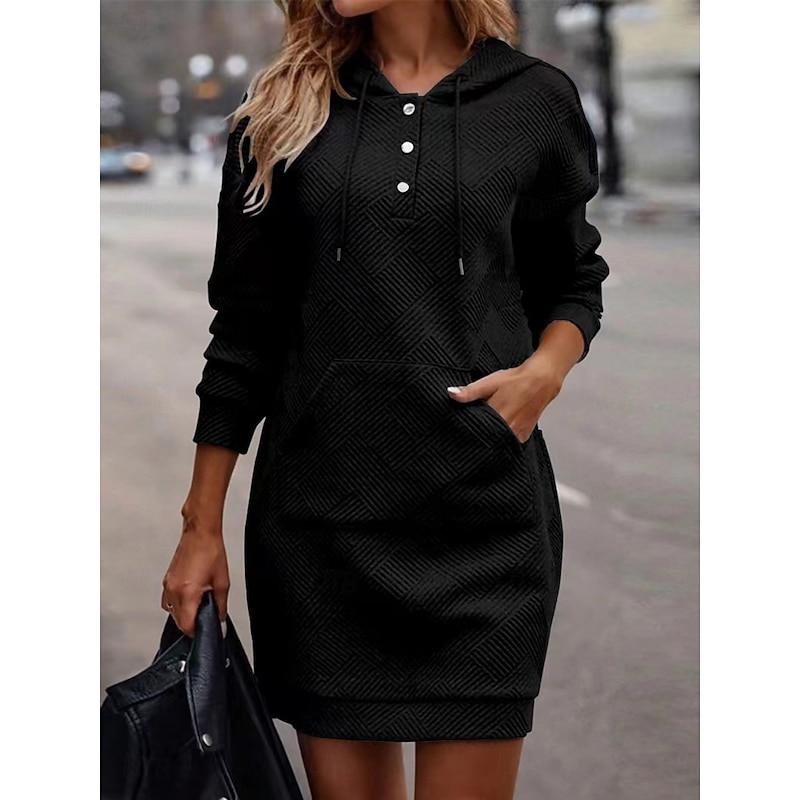Highlights [Fabric]: Crafted from a soft, comfortable polyester blend, this shift dress offers a micro-elastic fit, providing both warmth and flexibility ideal for casual wear. The neutral color options, including Black, Beige, Gray, and Khaki, make it a versatile addition to any wardrobe. [Fit]: Designed with a loose fit, this midi dress falls elegantly around the body, offering a relaxed and effortless silhouette. The long sleeves and above-the-knee length add a modern and youthful touch, perfect for everyday ease and style. [Design Highlights]: The dress features a sporty crew neck and an adjustable hood with drawstrings, giving it a laid-back, casual vibe. A convenient front pocket enhances practicality, adding to its sophisticated charm. Its plain pattern keeps it chic and understated, suitable for various occasions. [Occasions]: Ideal for dates, street outings, and other casual events, this women's shift dress is a perfect choice for those who value comfort and style in their everyday attire. It seamlessly transitions from a day out in the city to a relaxed weekend gathering. [Size Range]: Available in sizes S, M, L, XL, and 2XL, this dress accommodates a wide array of body types, ensuring a comfortable fit for everyone. Machine washable, it's easy to care for, maintaining its quality and charm wear after wear. Perfect for everyday use. superior materials and excellent craftsmanship ensure long-lasting durability.