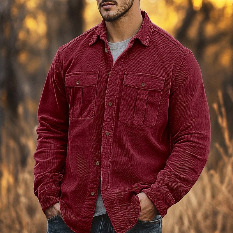 Why Choose Men's Casual Shirt Corduroy Shirt Button Up Shirt Black Red Navy Blue Blue Green Long Sleeve Solid Color Lapel Vacation Street Pocket Clothing Apparel toasty Fashion Streetwear Outdoor?
