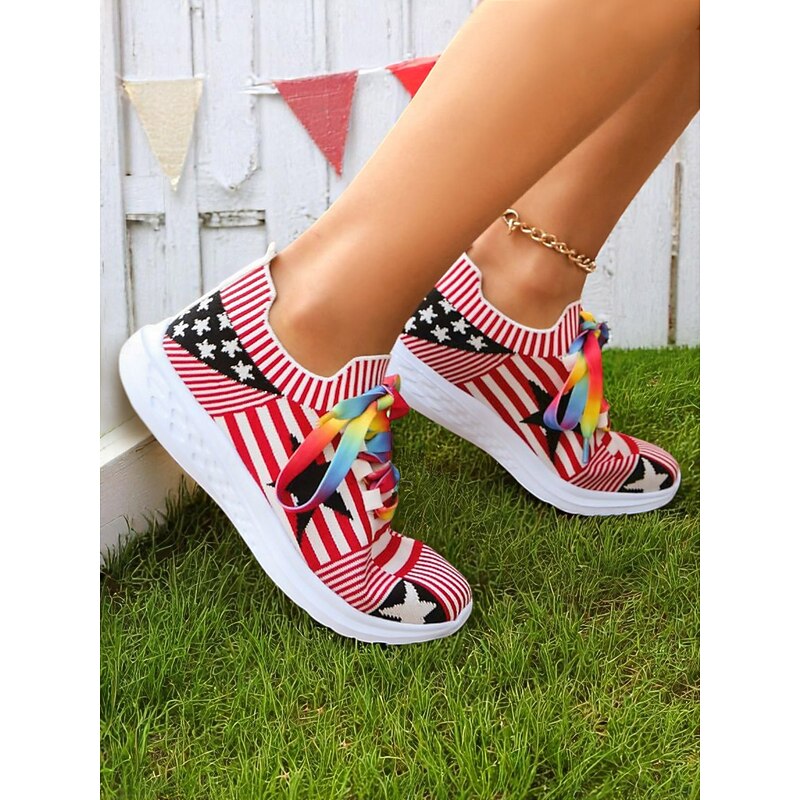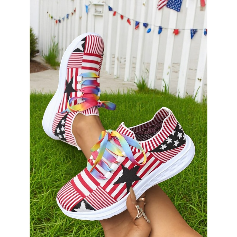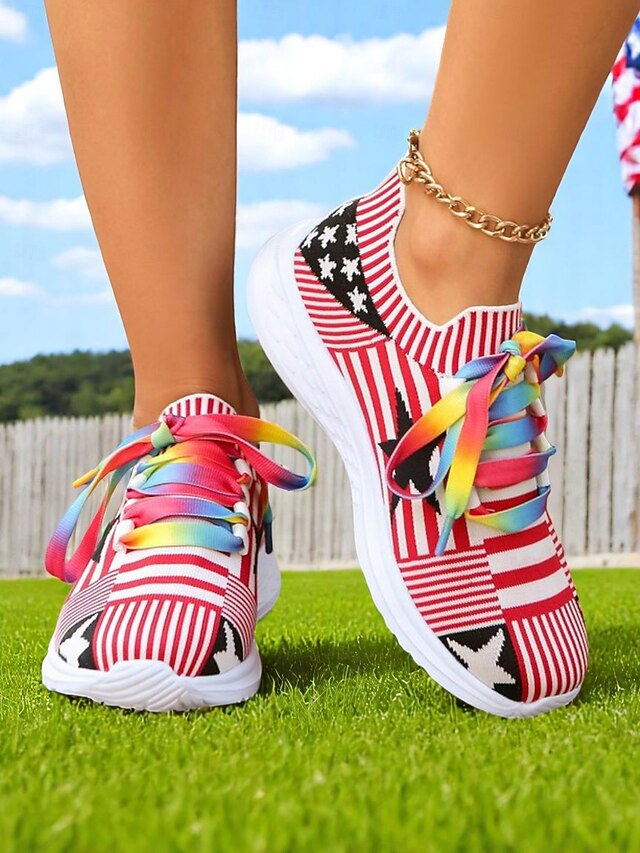 trending ! Women's Fourth of July Flyknit Sneakers with Colorful Rainbow Laces – Breathable Stars and Stripes Running Shoes for Independence Day and Everyday Sport Style