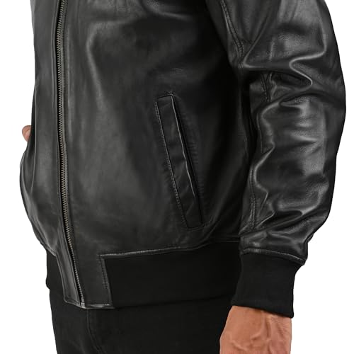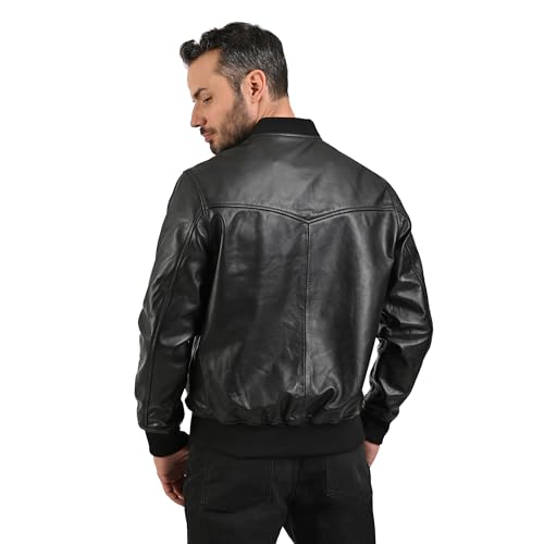 Frye MEN’S iconic LEATHER BOMBER JACKET, GENUINE LEATHER, RIBBED KNIT COLLAR, CUFFS AND HEM – BLACK COLOR