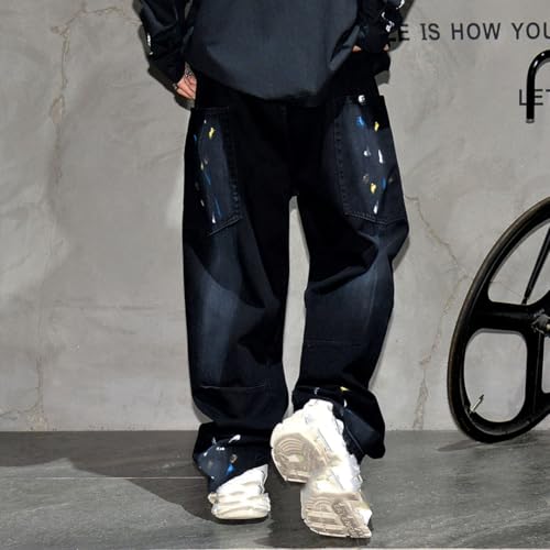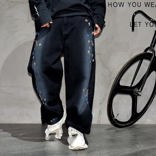 Men’S Hip Hop Hand-Painted Splash Baggy Straight Pants Button Fly Midweight Distressed Skateboard Full Length Jeans
