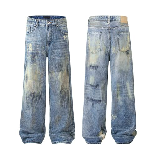 Jeans Pants Trouser Denim Retro Trendy Streetwear Spray Washed Blue Straight Leg for Men