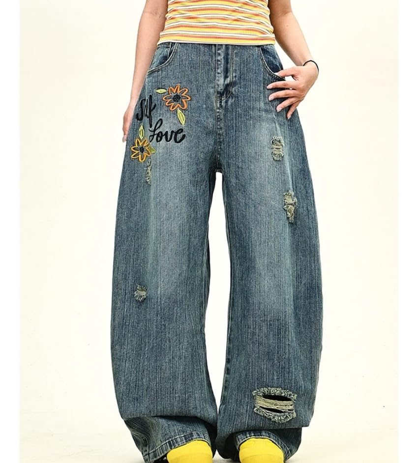 More information about Y2k Vintage Flower Letter Embroidery Slub Pattern Harajuku Baggy Jeans Hiphop Grunge Ripped Wide Leg Casual Denim Pants