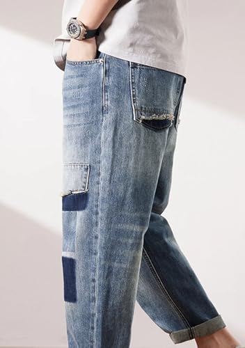 Men’S Urban Loose Fit Patchwork Tear Denim Cargo Pants Button Fly Distressed Wear Resistant Full Length Jeans