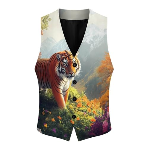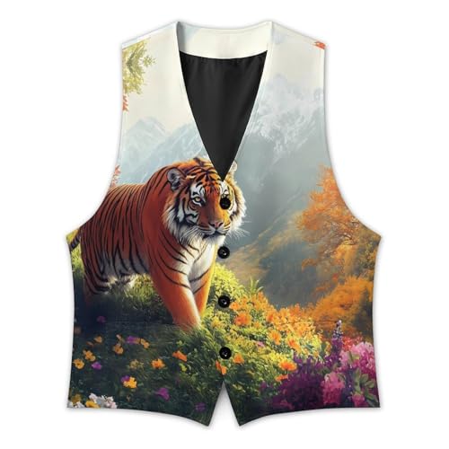 trending ! Tigers in The Mountains Suit Vest for Men Slim Fit Sleeveless Jacket V Neck Business Waistcoat Button Up Dressy Top
