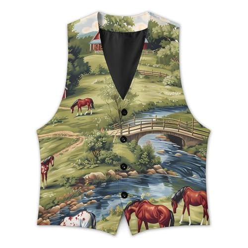 Farmhouse Bridge Horse Scene Novelty Men's Suit Vest Casual Formal Dress Vests Business Waistcoat